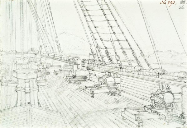 Рисунок выполнен П. Н. Михайловым во время кругосветного плавания 1819–1821 гг. под командованием капитана 2-го ранга Ф. Ф. Беллинсгаузена на шлюпе «Восток» или во время кругосветного плавания 1826–1829 гг. под командованием капитан-лейтенанта М. Н. Станюковича на шлюпе «Моллер».