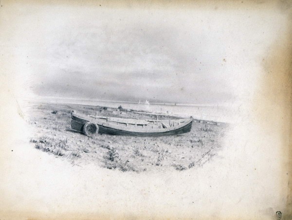 В самых ранних, старательно исполненных рисунках Куинджи, таких, например, как „Лодка на берегу“ (1872), свидетельствующих о тщательном штудировании натуры, еще не проявилась индивидуальность художника.