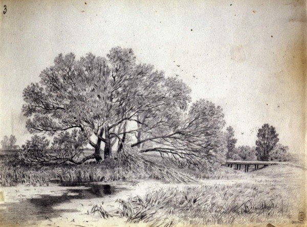 В самых ранних, старательно исполненных рисунках Куинджи, таких, например, как „Ветлы у речки“ (1872), свидетельствующих о тщательном штудировании натуры, еще не проявилась индивидуальность художника.