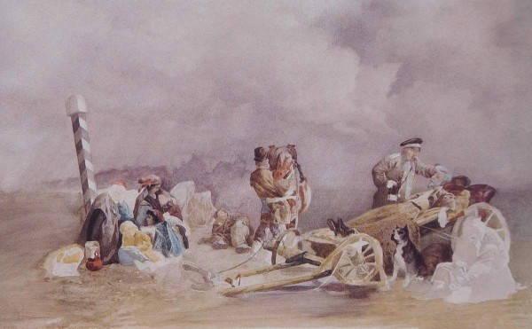 Большую роль в формировании социально-критического направления в русской живописи сыграл своей картиной «Привал арестантов» В. И. Якоби, обративший на себя внимание еще в 1858 году живо написанным «Разносчиком фруктов». Художник иного уровня дарования и иной творческой судьбы, чем Перов, Якоби в 1861 году сумел стать рядом с ним как смелый новатор. Представитель нового поколения учащихся Академии художеств, воспитанных в атмосфере огромного общественного подъема, он стремился, как и многие из них, служить своим искусством интересам народа, усматривая в содержательности замысла один из основных критериев ценности произведения. В те годы бесконечные скорбные вереницы ссыльных тянулись по этапу в Сибирь. С ними было народное сочувствие, о них заговорила литература, но изобразительное искусство до Якоби этой темы не затрагивало. Художник написал произведение, в котором все было реально и полно драматизма. Образ скончавшегося в дороге революционера характерен для живописи шестидесятых годов, когда в среде прогрессивной интеллигенции служение народу смыкалось с жертвенностью. Трагическая в своей основе картина прямо обличала власть, закон и всех тех, кто распоряжался народной судьбой. В журнале «Северное сияние» этой картине, приобретенной наряду с «Крестным ходом» Перова прозорливым П. М. Третьяковым, была посвящена специальная статья. «Случалось ли вам, – говорилось в ней, – испытать странное, даже неприятное болезненное чувство, когда по всему телу пробегает мгновенная дрожь, хотя вы не озябли и резкий ветер с дождем не преследует вас своим навязчивым воем? Точно такое чувство испытали мы перед картиной Якоби»13. В процессе работы над замыслом художник исполнил акварельный вариант картины, где вместо нарочито усиливающей драматизм сцены фигуры каторжника, стаскивающего перстень с руки умершего, изображены две собаки, а фигура ссыльного, осматривающего натертую кандалами ногу, лишь только намечена. Еще большее место, чем в картине, занимает здесь решенный в сизо-синей гамме пейзаж, способствующий образной выразительности акварели. Шувалова И. Н. Русское искусство 1860-х годов – вокруг Перова // Святые шестидесятые». Живопись, графика, скульптура. СПб. 2002. С. 16.