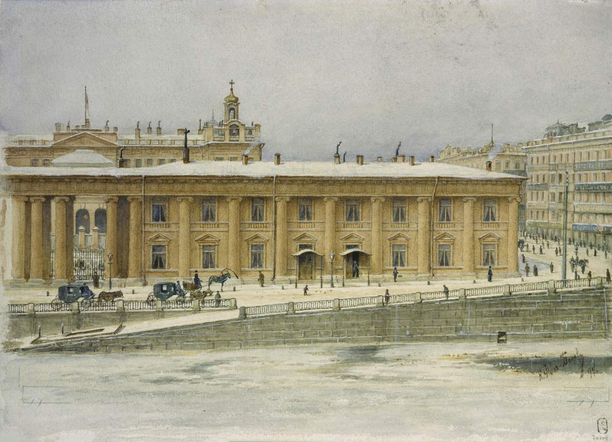 Виды Петербурга оставались излюбленным мотивом творчества членов ОРА как продолжателей традиции мастеров середины XIX века – В. С. Садовникова, Л. 0. Премацци, А. И. Шарлеманя и других. Здание «Кабинет его величества» построено на берегу Фонтанки на территории усадьбы Аничкова дворца в 1803–1805 годах по проекту Д. Кваренги. Вера Пудова // Санкт-Петербург: Портрет города и горожан. СПб, 2003. С. 136.