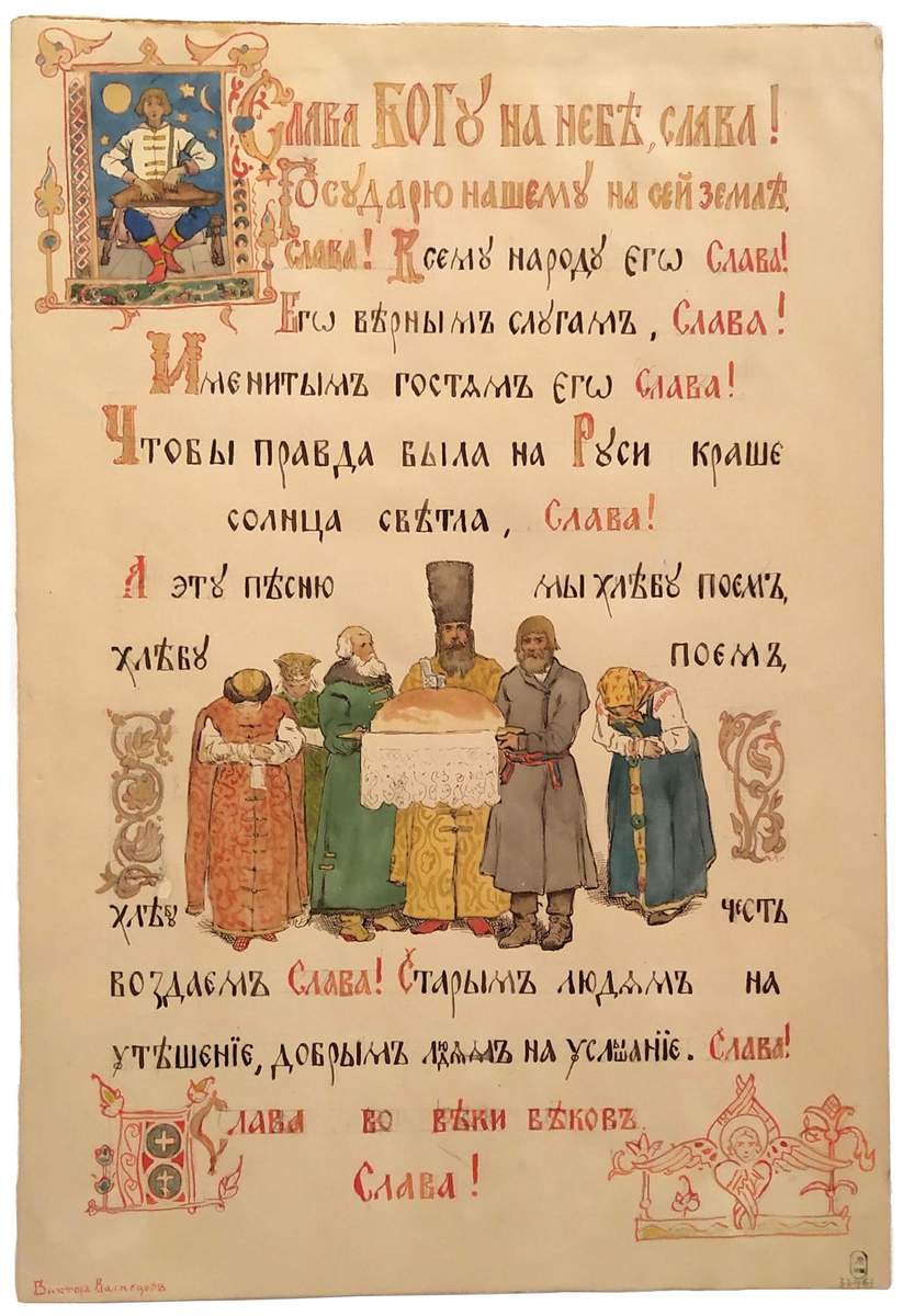 Слева внизу подпись: Викторъ Васнецовъ; на листе рисованный вязью текст: Слава Богу на небѣ, слава!.. А эту пѣсню мы хлѣбу поемъ, … хлѣбу честь воздаемъ Слава!..