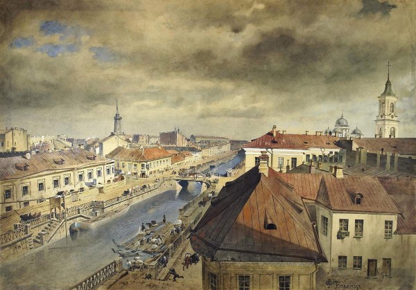 Прошедшие без малого полтора столетия сильно изменили облик застройки на отрезке канала у Вознесенского проспекта. Справа видны купола Вознесенской церкви и колокольни, уничтоженных в 1930-х годах. Пространство города представлено как бы с высоты птичьего полета: в панораму попадает и небо с грозно нависшими тучами, и бесконечная перспектива канала, и разноликая череда зданий, и пульсирующая повсеместно, заманчивая жизнь обитателей города. Ирина Верховская  // Санкт-Петербург: Портрет города и горожан. СПб, 2003. С. 90.