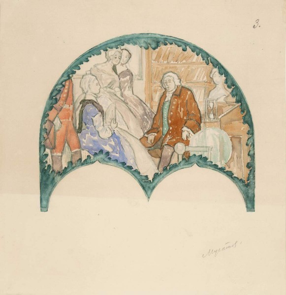 На выставке «Мира искусства» 1906 года, уже после смерти художника, были показаны два эскиза к ним: «Екатерина II у Ломоносова» и «Застигнутые грозой» [декоративное панно — ФС-1039]. Оба эти эскиза попали соответственно в музейные собрания: в Русский музей (Санкт-Петербург) и Третьяковскую галерею (Москва). Елена Иванова // Дягилев и его эпоха. СПб, 2001. С. 89.