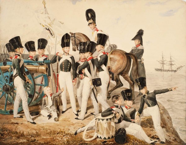 Акварель Брюллова висела в спальне великого князя Константина Павловича (позже в этом помещении размещалась библиотека императора Александра II). В 1831 году акварель литографировал Александр Васильевский, и в 1833 году по приказу Николая I эти литографии были размещены во всех кадетских корпусах. Великий князь Александр Николаевич изображен в форме кадета гренадерской роты 1-го Кадетского корпуса, опираясь на ружье, рядом с пушкой, среди своих сверстников-кадетов. Около пушки сидит великий князь Константин Николаевич. За группой кадетов справа стоит воспитатель-наставник цесаревича генерал-майор Карл Мердер (1787–1834).
