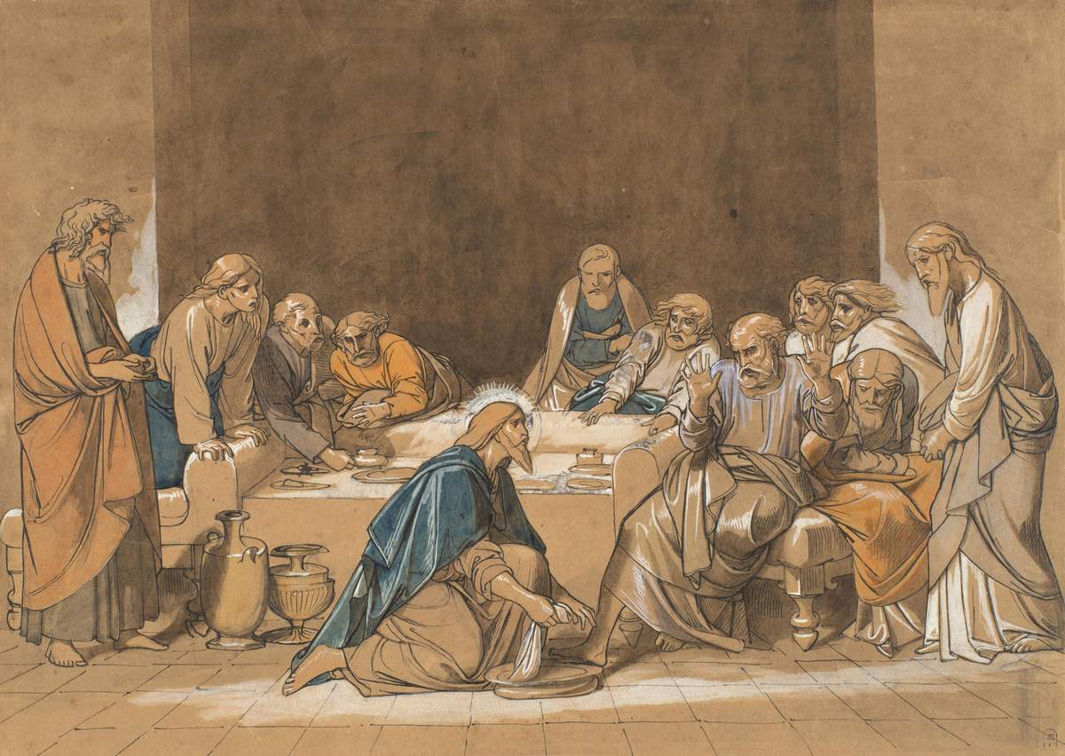 В июле 1845 Федор Бруни привез из Италии в Петербург вместо двенадцати заказанных ему евангельских сюжетов двадцать пять картонов для будущих росписей в Исаакиевском соборе, среди них – „Омовение ног“. В Русском музее имеется четыре эскиза на эту тему: данный, являющий собою предварительную разработку цветового решения будущей росписи; эскиз, исполненный графитным карандашом, с надписью сына художника, подтверждающей авторство Бруни; выполненный тушью, возможно являющийся более поздним авторским повторением, и окончательный эскиз (так называемый картон), выполненный углем, итальянским карандашом и жидкой тушью, непосредственно предшествующий росписи и поступивший из Академии художеств в музей при его основании. В этом ряду отсутствует лишь эскиз, получивший „высочайшее утверждение“, после представления которого следовало „высочайшее повеление“ приступить к изготовлению картона. Над предварительными эскизами для росписей Исаакиевского собора Бруни работал в Риме с 1841 по 1843 год, над картонами – там же с 1843 по 1845 год. Торжественный композиционный ритм и строгая красота линии всех эскизов „Омовения ног“ близки творчеству „любимейшего живописца“ Бруни – великого итальянца Фра Беато Анжелико, что было отмечено в свое время В. Толбиным в известной статье „Ф. А. Бруни и его значение в русской живописи“ („Сын Отечества“. 1856. №21, 23, 24). Татьяна Сизоненко // Иисус Христос. СПб, 2000. С. 209.