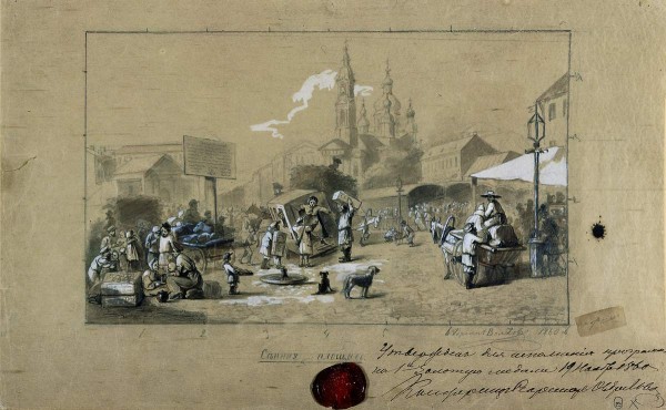 Справа внизу: Адрiанъ Волковъ 1860; внизу надпись: С_нная площадь; справа внизу надпись: Утвержденъ для исполненiя программы на 1ую Золотую медаль 19 Ноября 1860 Конференцъ Секретарь ФедоЛьвовъ; внизу посередине сургучная печать ИАХ