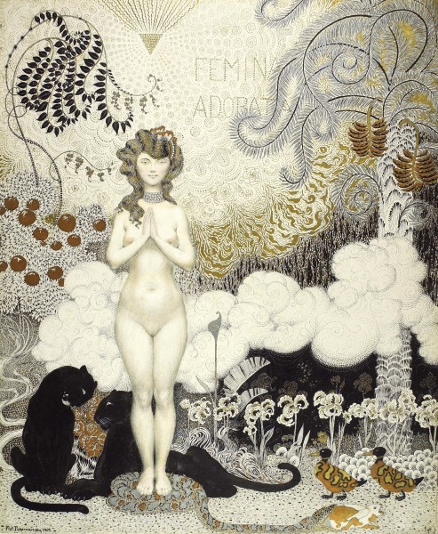 - Картон, тушь, акварель, бронзовая краска, серебряная краска. 35 × 28,8