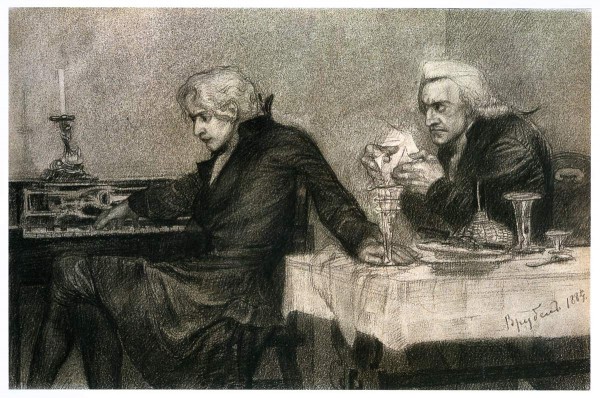 Литературная классика постоянно питала воображение Врубеля. Известные рисунки к трагедии А. С. Пушкина „Моцарт и Сальери“ созданы им для показа через волшебный фонарь на вечере учеников <Академии> в Рождество 1884 года. Рисованные карандашом, они удачны в выборе моментов пьесы и в разработке характеров. В создании образов художник мастерски воспользовался эффектами светлого и темного, ролью интерьера, усиливающего эмоциональную насыщенность сцен. / Владимир Круглов. Наследие Михаила Врубеля в Русском музее // Михаил Врубель. СПб, 2006. С. 14.