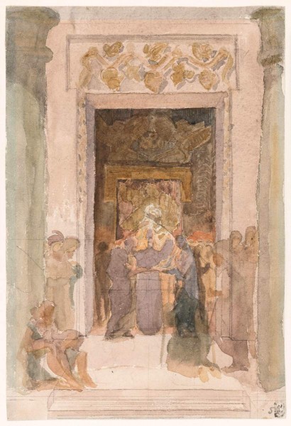 В таланте композиции <Врубеля> со всей несомненностью убеждает рисунок пером «Обручение Святой Девы Марии с Иосифом» (Р-13464), выполненный в 1881 году и получивший серебряную медаль 2-го достоинства на третном экзамене. Он был оставлен в Академии как образец для копирования (оригинал) и пользовался особым вниманием учащихся. Торжественная строгость этого рисунка заставляла вспомнить о классических традициях, о мастерах Возрождения, в то время как акварельный набросок той же композиции, напротив, говорил об очень своеобразном, далеком от каких бы то ни было образцов и шаблонов, цветовом видении. В нем уже были те особенные, врубелевские, оттенки фиолетового и зеленого, которые впоследствии делали его картины такими узнаваемыми. / Юлия Солонович. Графика Михаила Врубеля // Михаил Врубель. К 165-летию со дня рождения. СПб, 2022. С. 18.