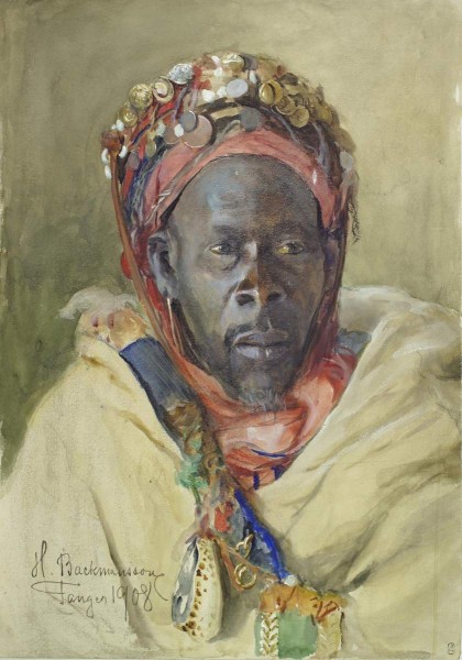 Значительная часть жизни Гуго Бакмансона, профессионального военного и художника-баталиста, выпускника Санкт-Петербургской Академии художеств, прошла в путешествиях. Начиная с конца 1890-х годов он часто бывал в Северной Африке, подолгу жил в Марокко и Тунисе, возвращаясь туда вновь и вновь. Многочисленные этюды, созданные им в поездках, регулярно экспонировались на выставках Петербурга и Москвы. Одним из самых притягательных мест для художника стал Танжер, крупный портовый город на севере Марокко. Здесь в 1908–1910 годах он исполнил акварельные виды и портретные зарисовки местных жителей. Вероятно, его интерес к городу не ограничивался вниманием только к типажам и яркости красок природы. В начале XX века Танжер оказался важным центром европейской политики и происходившие в нем события, такие как Танжерский и Агадирский кризисы, оказали влияние на ход мировой истории. После разделения страны в 1912 году на французский и испанский протектораты, в 1923 году Танжер признали международной зоной под управлением Испании, Франции и Британии, обозначив его особый статус. Наталия Соломатина // Африка в русском искусстве. СПб. 2023. С. 66.