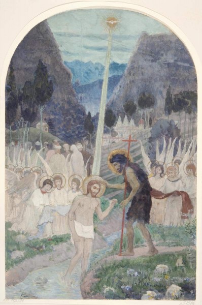 В 1895 году исполнением большой стенной картины „Крещение (Богоявление)“ Нестеров завершил свою работу над образами Владимирского собора в Киеве. Первый эскиз „Крещения“ был исполнен еще в 1891 году и хранится в Русском музее. Композицию этого произведения, как вспоминал позднее художник, он взял „с одного древнего образа из Братского монастыря“. Работая над фигурами Христа и Иоанна Предтечи, Нестеров исполнил множество натурных рисунков. Но главный интерес, по его словам, для него представлял пейзаж, через который он хотел сообщить произведению мистическое, религиозное настроение. В какой-то степени художнику это удалось. Критика, однако, упрекала Нестерова за искусственность колорита, неестественность поз Христа и Иоанна, болезненно-унылое впечатление, которое выносил зритель после созерцания картины. В дальнейшем художник учел эту довольно суровую оценку его труда. Во всяком случае церковная живопись Нестерова стала более нарядной, праздничной, „пасхальной“, что более соответствовало главным идеалам Православия. Павел Климов // Иисус Христос. СПб, 2000. С. 106.