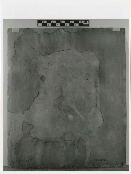 Авторский лист очень сильно пожелтел. Бумажная основа пересохла, по всей поверхности пятна различного происхождения и бурые затеки, особенно интенсивные в центральной части листа и по правому краю. Лист сильно покороблен, углы и края обветшали – в жестких изломах и разрывах. По краям потертости красочного слоя. В центре листа около изображения два пятна жира высокой концентрации. Справа вверху – содранность верхнего слоя бумаги. На обороте сильное пожелтение, затеки, загрязнения, следы экскрементов насекомых. По углам остатки бумажных наклеек.