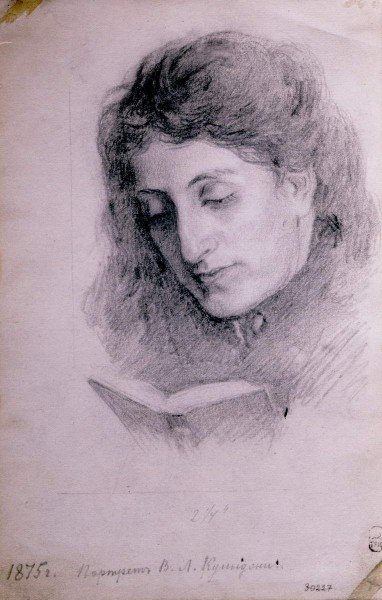 Легким касанием карандаша, но более тщательно, с использованием нежной прозрачной штриховки, исполнен портрет читающей книгу жены художника, датированный 1875 годом – годом их свадьбы.