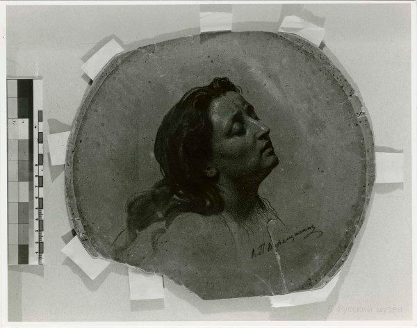 Рисунок был выполнен на вержированной бумаге, сплошь наклеенной на коричневый картон, частично обклеен по краям полосками бумаги. Верхний и нижний края произведения были срезаны. Авторский лист был сильно и неоднородно пожелтевшим, имел следы экскрементов насекомых, белесые пятна на полях, боковые края произведения имели коричневый цвет. В нижней части рисунка имелась большая утрата (11х1,5 см), справа по нижнему краю разрыв ок. 8 см с выкрошками основы. Имелись небольшие разрывы и утраты по краям произведения.