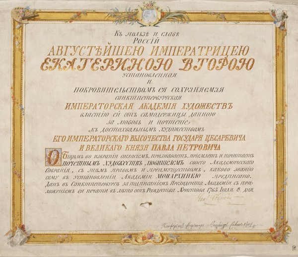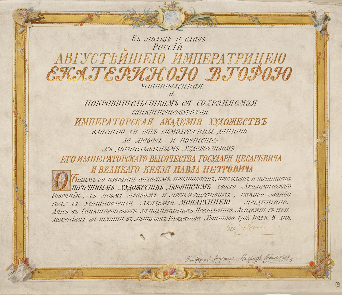 Диплом на звание Почетного любителя художеств, выданный его императорскому высочеству государю цесаревичу и великому князю Павлу Петровичу