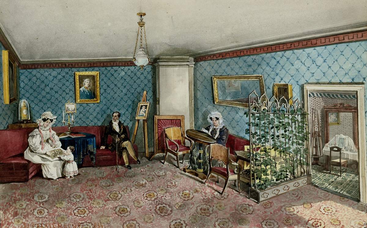 Расцвет интерьерного жанра в акварели приходится в России на 1830-е годы. Изящные виды дворянских гостиных, кабинетов в это время заполняют альбомы, украшают стены домов. Интерьеры, изображенные художниками, редко бывают безлюдны. Они наполнены неторопливой созерцательной деятельностью и простыми семейными радостями их обитателей. Изображенная Шарлеманем семья художника, которая, возможно, является его собственной, занята изучением произведений искусства и творчеством. Наталия Соломатина // Санкт-Петербург: Портрет города и горожан. СПб, 2003. С. 236.