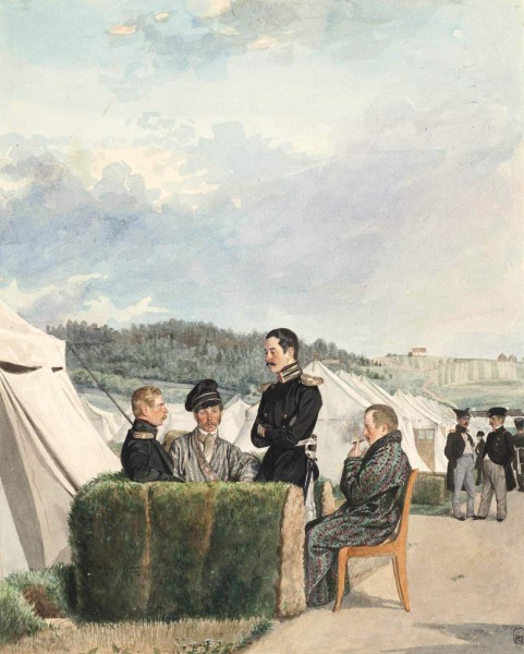 В лагере, на передней линейке. Групповой портрет офицеров лейб-гвардии Финляндского полка (Э. К. Шульц 2-й, Е. Е. Иордан, Р. И. Андронников, П. Е. Тизенгаузен; на заднем плане: И. Ф. Орбелиани и П. А. Шмидт)