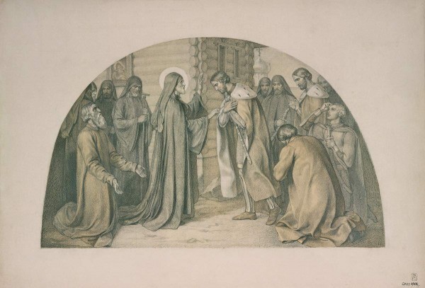 Сергий Радонежский благословляет Дмитрия Донского на побоище и с ним отпускает двух иноков Ослябю и Пересвета