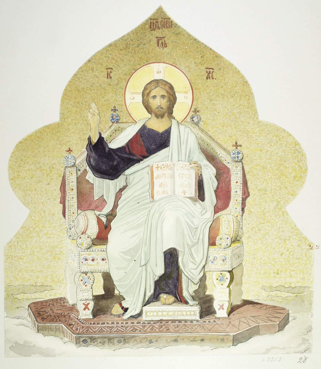 „Христос на троне“ является стилизацией аналогичных древнерусских мозаичных композиций, что было характерно для историзма середины XIX века. Однако и здесь, как во всех других монументальных эскизах художника, присутствует академическая основа. Вера Пудова // Иисус Христос. СПб, 2000. С. 404.