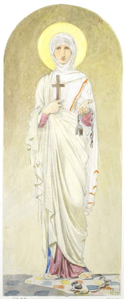Екатерина Александрийская (287—305) — христианская великомученица, родом из Александрии, мученическую кончину которой относят ко времени правления римского императора Максимина (или Максенция). Изображается увенчанная короной, с книгой, символом её знаний, с пальмовой ветвью, знаком мученичества на колесе с шипами; иногда с мечом, которым её обезглавили. Память в Православной церкви совершается 24 ноября (7 декабря).
