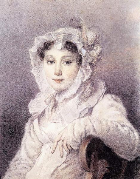 Один из самых поэтичных женских образов эпохи романтизма. Одетая в домашнее платье, Елизавета Терезия сидит в простой, уютной позе. Подчеркнутая обыденность достигается и колористическим решением портрета. Он исполнен на небольшом белом листе бумаги, лишь «прокрытом» серой акварелью и итальянским карандашом, создающим иллюзию фактуры и цвета платья; легкими касаниями сангины и пастели художник «лепит» лицо, волосы, капор изображенной.