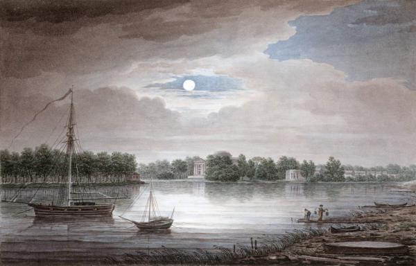 Грозовое небо и луна, отражающаяся в воде, спокойный «непарадный» вид, выбранный художником для изображения, типичны для искусства романтизма. Небольшая по размерам акварель вполне выражает те же эмоции, что и живописные полотна. Такое явление возможностей графики, равных живописи, также было свойственно художникам-романтикам. Русский музей. От иконы до современности. СПб. 2015. С. 116.