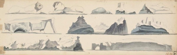 На обороте кат. 303. Эскизы композиции кат. 179, к литографии № 13 из «Атласа к путешествию капитана Беллинсгаузена».. 1819–1820