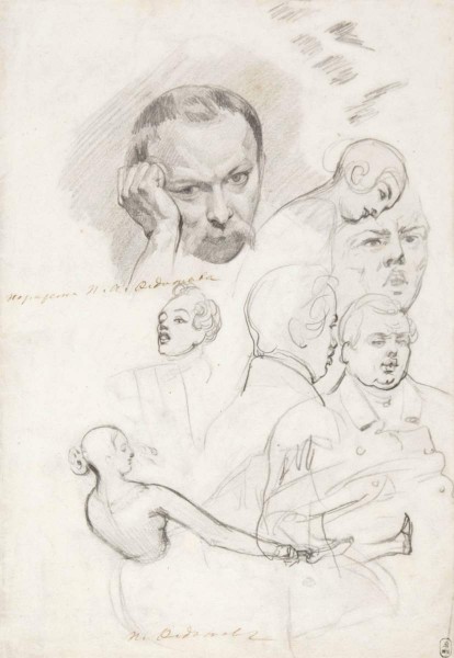 На обороте: Полуобнаженная женщина. Женщина в чепце. Женский портрет. Женская голова. Мужская голова. Семь набросков. 1846-1847