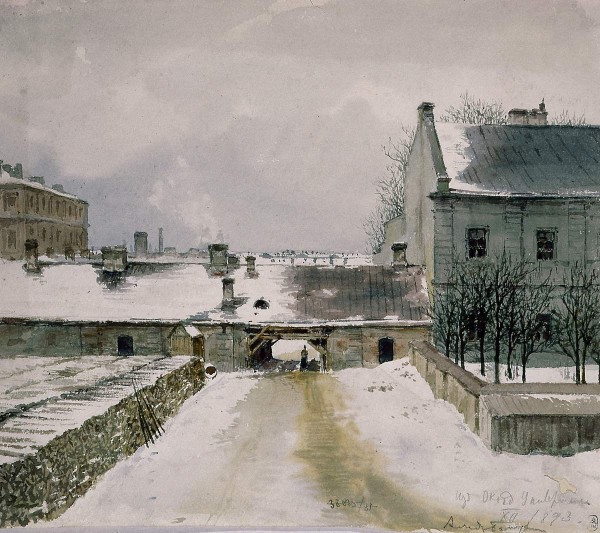 Комплекс университетских зданий, главным из которых было здание Двенадцати коллегий, предстает на рисунке Бенуа не с парадной стороны, а со стороны двора, хорошо знакомого художнику, учившемуся в те годы на юридическом факультете. Этот уютный и не столичный пейзаж — хозяйственные постройки, поленницы, дом петровской архитектуры — он мог видеть из окон длинного коридора, тянущегося из конца в конец второго этажа здания Двенадцати коллегий. Юлия Солонович // Санкт-Петербург: Портрет города и горожан. СПб, 2003. С. 200.
