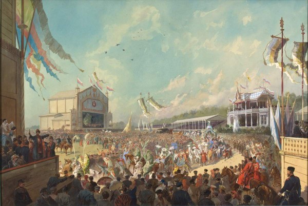 На акварели видно, что Ходынское поле, впрочем как и вся Москва, были украшены по случаю коронационных торжеств целым морем бело-сине-красных флагов. Незадолго до этого высочайшим указом государь утвердил этот триколор, названный им «русским», в качестве единого общенационального флага, наряду с черно-желто-белым имперским стягом.