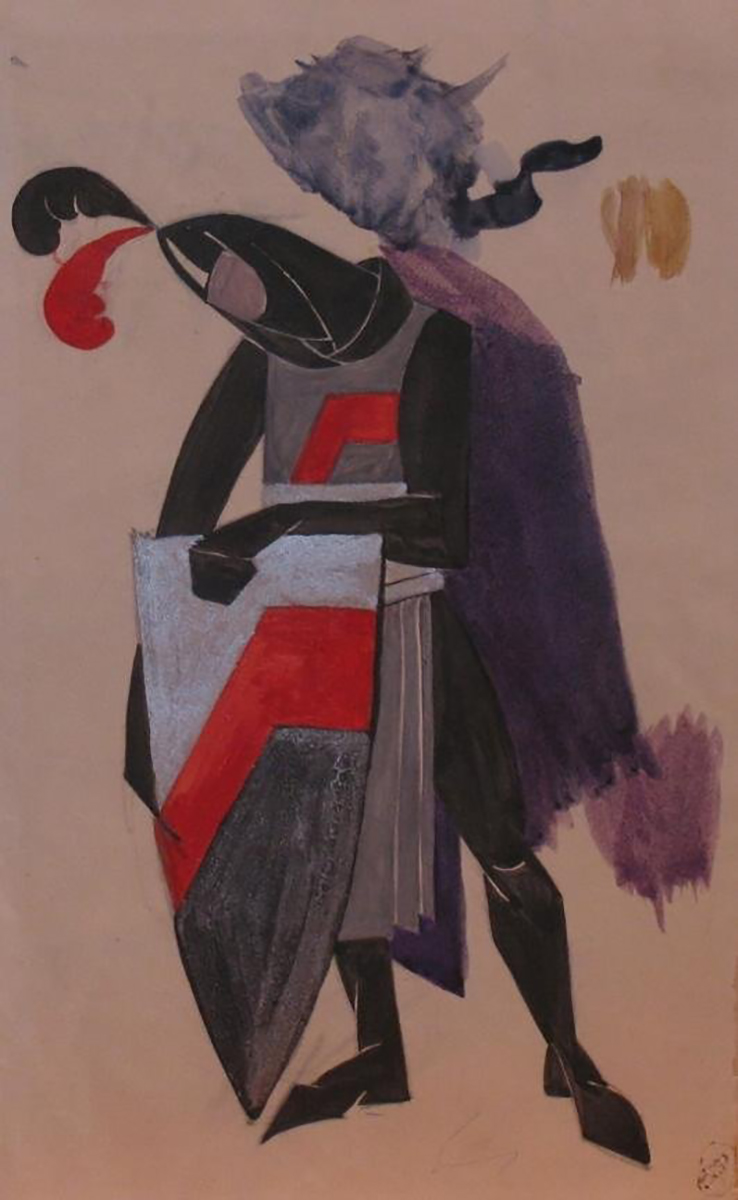 Известно, что после «Фамиры Кифареда» Таиров предполагал поставить в Камерном театре «Розу и Крест» А. А. Блока, но согласия поэта не получил: Блок надеялся увидеть свою драму на сцене Художественного театра*. Однако Мухину это обстоятельство не остановило. Следом за «Ужином шуток» появляются эскизы костюмов к «Розе и Кресту» (РБ-23013-23017, РБ-23083): Бертран, Алиса, Рыцарь в золотом плаще. Вновь, как и для предыдущего спектакля, Мухина делает варианты эскизов в маленьком формате и на больших листах. К последним относятся Рыцарь в золотом плаще (Рб-23083) и Бертран по прозвищу Рыцарь-Несчастье — сторож замка (Международный благотворительный фонд «Константиновский», Петербург). Простота рубленых форм и пластическая мощь этих фигур говорят о «скульптурном» мышлении создателя, об умении достичь выразительности экономными, тщательно выверенными средствами. Юлия Солонович. Мухина и театр // Вера Мухина. СПб, 2009. С. 21.
