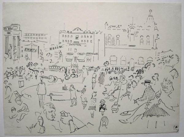 В довоенном творчестве петербургского художника Бориса Ермолаева основное место принадлежит городскому пейзажу. В период его пребывания в Общине художников, позднее реорганизованной в Цех художников, по воспоминаниям самого автора, почти вся работа проходила на улицах города с карандашом или пером и пузырьком туши в руках. Наброски этого периода условно можно разделить на несколько серий. Наиболее значительную образуют представленные экспрессивные рисунки пером, сделанные в Александровском саду у Адмиралтейства. Эти острые, отчасти шаржированные линейные наброски, с пронзительной достоверностью доносят до нас характерные типажи и терпкий аромат ушедшей эпохи. Виктория Белая // Санкт-Петербург: Портрет города и горожан. СПб, 2003. С. 246.