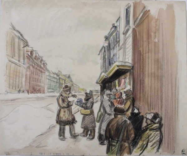 Кондратьев прожил в Ленинграде всю блокаду, занимался маскировочными работами для аэродрома на Ржевке. Фонтанка и Моховая улица – маршруты почти ежедневных походов художника к Невскому проспекту, зданию райсовета, где сдавались эскизы, получались новые задания и где он получал оплату за сделанную работу талончиками в столовую. «Рисовать, как летописец», как писала в блокадном дневнике друг художника Т. Н. Глебова, было потребностью Кондратьева. В его зарисовках нет пафоса героизма, нет желания подчеркнуть ужас страдания. Они действительно документальны. Людмила Вострецова // Санкт-Петербург: Портрет города и горожан. СПб, 2003. С. 422.