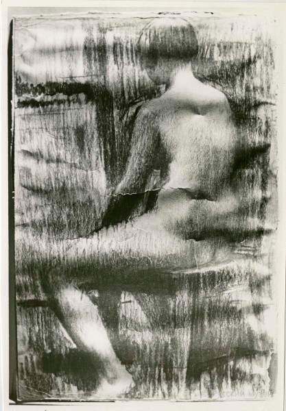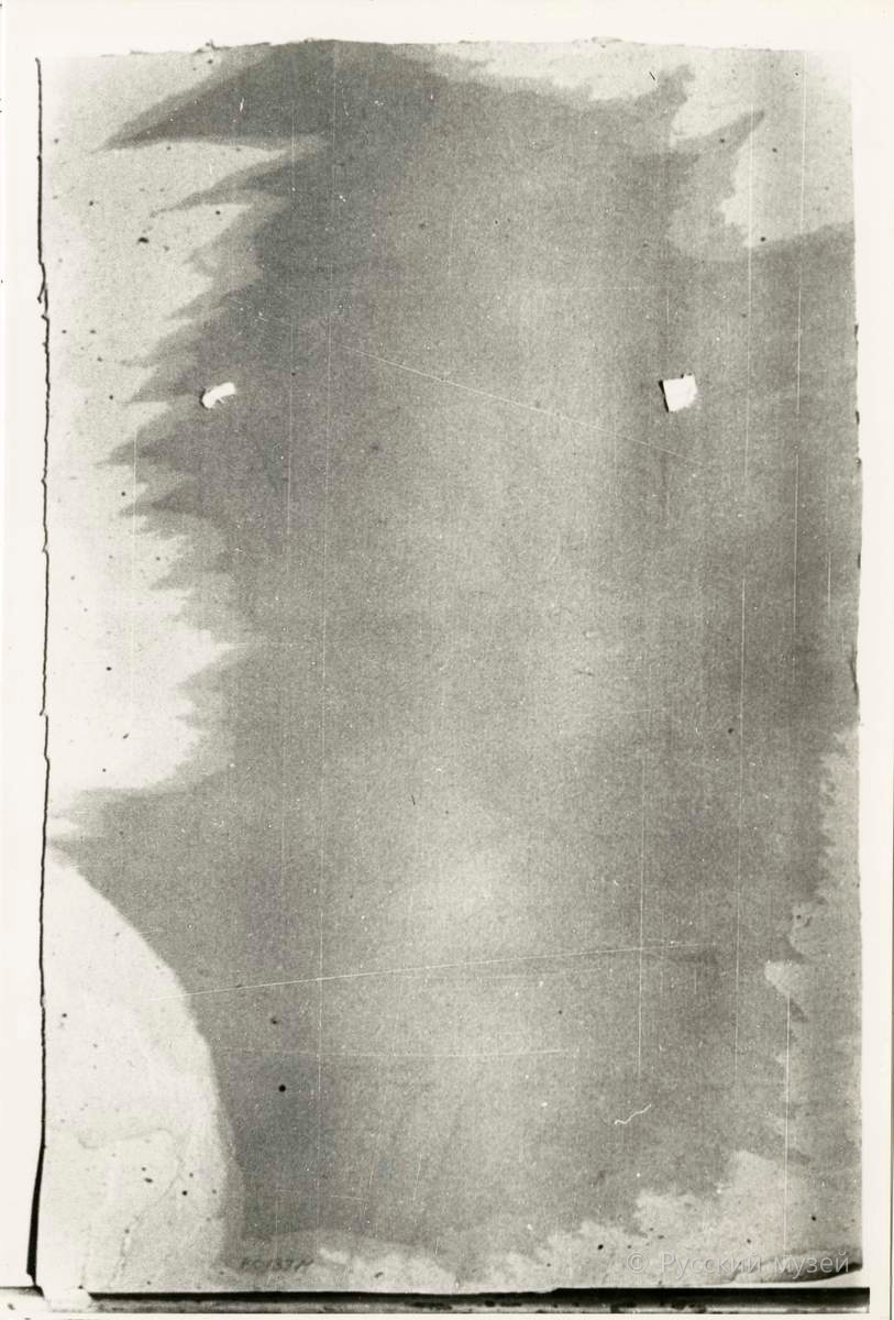 Авторский лист был по периметру приклеен на серый картон силикатным клеем. Лист был значительно деформирован. В центре изображения и по краям листа жесткие изломы. На верхнем крае были проколы, по правому краю внизу был разрыв. По листу располагались пятна клея. Оборотная сторона была сильно загрязнена, имела неравномерное пожелтение. Бумага в местах нанесения клея значительно повреждена.