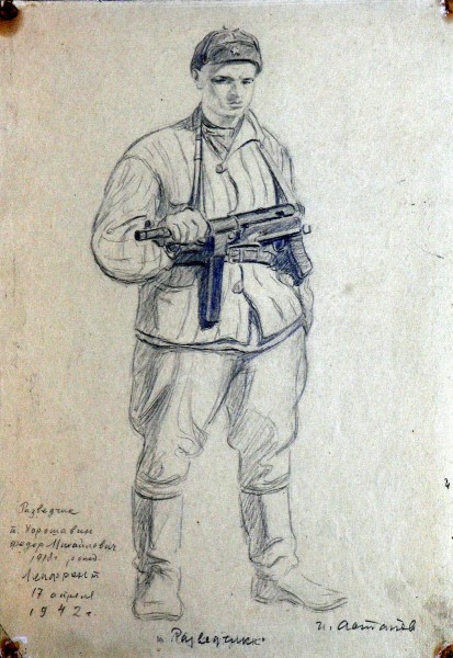 Подпись на листе: Разведчик т. Хорошавин Федор Михайлович, 1918 рожд. Ленфронт. 17 апреля 1942 г.