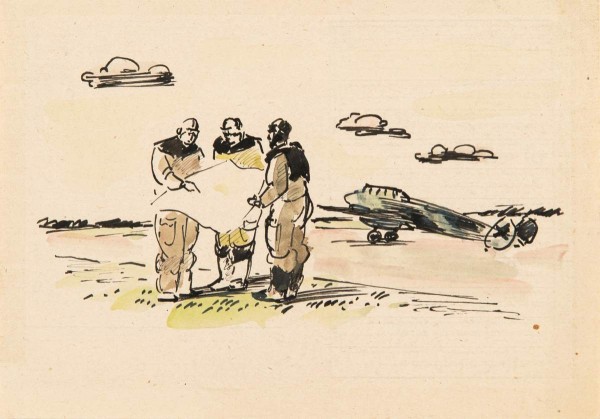 Home page Online resourcesCollectionsDrawing and Waterсolours Летчики Кондратьев П. М. 1902, Саратов — 1985, Ленинград Летчики 1944 Paper, ink, watercolour, brush. 13,9 x 19,9 РС-17017 Period Early 20th century CategoryGenre Painting Keywords The Great Patriotic War | Soviet Art | The Leningrad School | group portrait | Servicemen | Airplanes, parachutes Virtual exhibitions and 3d-tours The Great Patriotic WarLeningrad will be the measure of honor! Share «Виртуальный Русский музей» в социальных сетях: