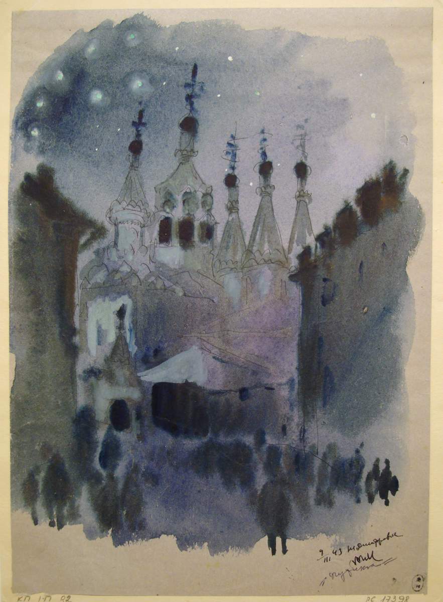 - Бумага серая, акварель, чернила, перо, белила, гуашь. 28 x 20