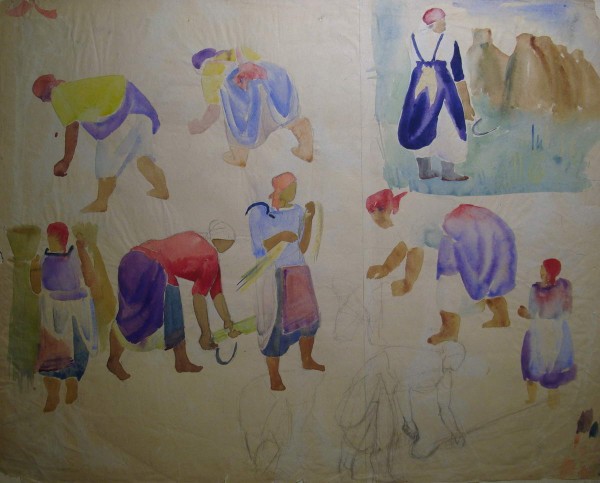 Оглядываясь на «крестьянский цикл» Малевича, Пакулин создал свою версию реализма. Он написал огромное полотно <«Жница» (1926–1927)>, добиваясь внешнего сходства с фреской, лишь отдаленно напоминающее о первоначальных натурных зарисовках и этюдах, и некоторые из них, об этом ясно свидетельствуют. Тот же путь «очищения» мотива от суетной будничности прослеживается и в другой программной работе художника «Женщина с ведрами». Так, в «Жнице», отбросив одни детали и рельефно изображая другие, умышленно усиливая динамику контрастов, свободно сдвигая пространственные планы и контуры объемов, художник нашел пластический эквивалент физического напряжения, преодоления тяжести. Ольга Мусакова. Вячеслав Пакулин. В поисках стиля эпохи // Вячеслав Пакулин. В поисках стиля эпохи. СПб. 2021. С.10.