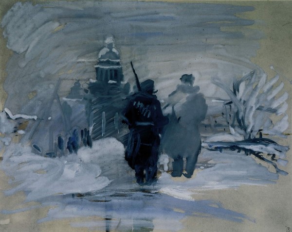 Трудно сказать, когда, в какой момент, но Пакулин понял, что он может рассказать все о войне и блокаде именно в пейзаже. В самую суровую ленинградскую зиму 1941–1942 годов художник начал работу над серией пейзажей. За два с половиной года он создал их несколько десятков. «Блокадную серию Пакулин создавал, не задумывая ее заранее. Само собой, в ходе творческой работы получилось, что все этюды сцеплены единым эмоциональным звучанием, которое связывает их в один непрерывный ряд. Он стремился к подлинности ощущений, поэтому, невзирая на холод, обстрел, голод, он работал на улице»*. <…> Теперь сосредоточенно всматривался художник в меняющийся облик города, стараясь не пропустить мгновения, уходящие в вечность. В ситуации близости смерти ему по-настоящему открывалась величественная красота Ленинграда, она вселяла надежду. Пакулин был одним из тех, кто смог это почувствовать и выразить в своих пейзажах. Зимой 1941–1942 года, как вспоминали очевидцы, город был особенно красив: искрящийся инеем, сверкающий белизной неубранного снега — его выпало тогда на редкость много. Замерло движение на безлюдных улицах. Ольга Мусакова. Вячеслав Пакулин. В поисках стиля эпохи // Вячеслав Пакулин. В поисках стиля эпохи. СПб. 2021. С. 12.