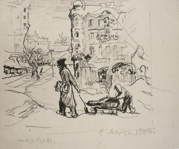 Эскиз к гравюре «На работу в 1941-1942 году»