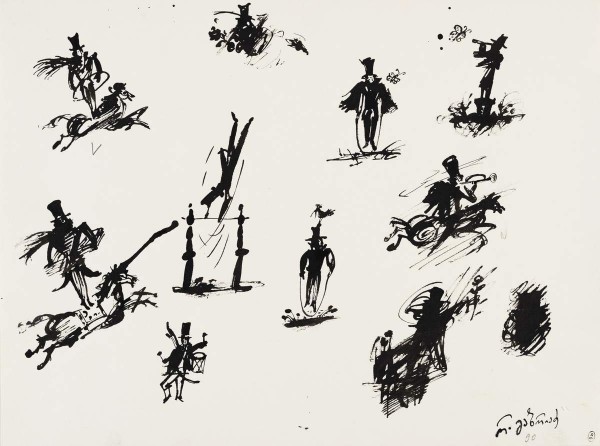 Десятки листов, нарисованных Габриадзе, повествуют о том, что могло бы быть с Пушкиным, если бы ему разрешили уехать, и он бы побывал в Испании, и о том, что с ним происходило на Кавказе.