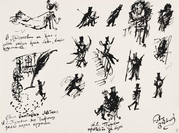 К истории возникновения этих рисунков равно причастны два друга — художник Резо Габриадзе и писатель Андрей Битов, вдохновенно сочинявшие новые эпизоды биографии поэта. Согласно неожиданному, но точному определению Андрея Битова, «Пушкин — первый наш не выездной». <...>