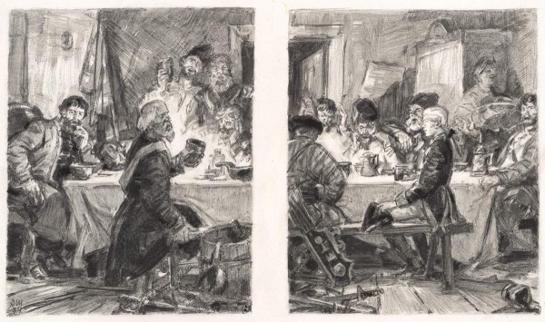Иллюстрация к повести А. С. Пушкина «Капитанская дочка». 1974. Изд.: Пушкин А. С. Капитанская дочка М.: Детская литература, 1976. С. 104–105. Левая и правая части разворота. 1974