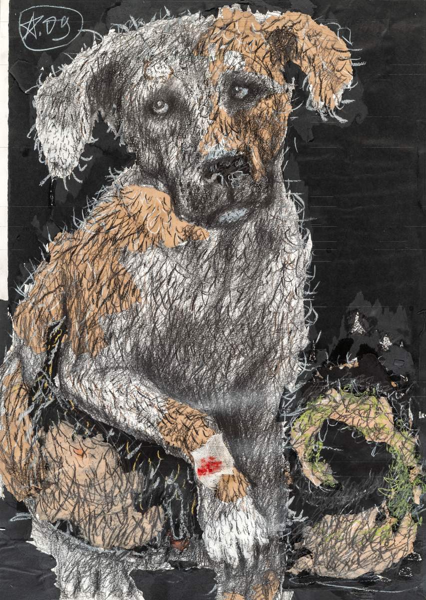 - Бумага грунтованная, цветной карандаш, графитный карандаш, черная бумага, бумага оберточная, бинт. 70 x 49,5