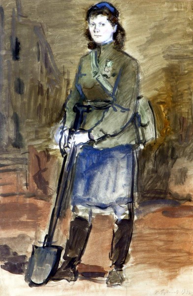 В годы войны известный график и иллюстратор книг К. И. Рудаков жил и работал в Ленинграде. Участвовал в работе над живописными агитпанно к 25–й годовщине Октября (1942). Делал эскизы костюмов к пьесам Чехова и Шекспира, а также к постановкам Театра музыкальной комедии. В этот период мастер выполнил портреты ленинградских женщин – бойцов МПВО.