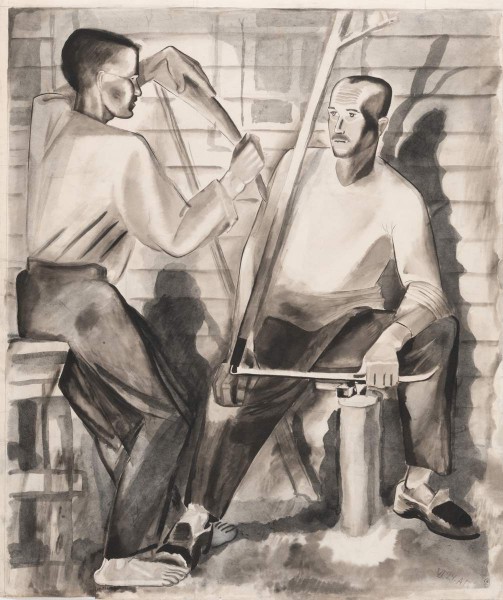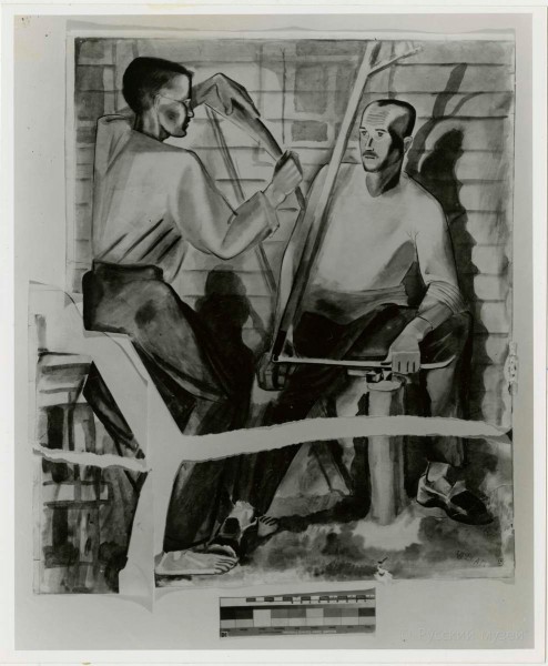Авторский лист был, механически очищен гот посторонних загрязнений, снят с фанеры с помощью увлажнения, удалены полоски бумаги и остатки клея по периметру (с лица и оборота). Произведение было промыто в дистиллированной воде на листах фильтровальной бумаги. Была проведена общая и местная химическая обработка листа с последующей промывкой без погружения. Авторский лист был подклеен, сдублирован на тонкую реставрационную бумагу. Отпрессован; тонирован в местах утрат красочного слоя.