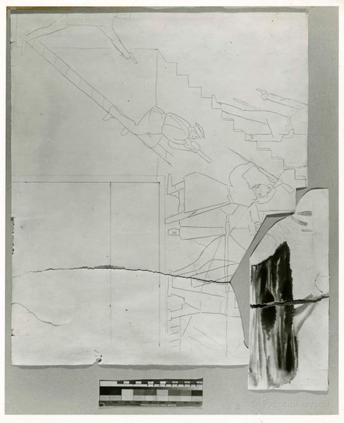 Авторский лист был по периметру наклеен на фанеру, обклеен по краям полосками бумаги шириной 1,3 см. Горизонтальный разрыв проходил через весь лист в нижней трети авторского листа, имелись разрывы по краям, наибольший по нижнему краю ок. 13 см. В левом нижнем углу авторская вставка 9,3х13 см. Имелись широкие желтые пятна от клея по всем полям рисунка, пятна фоксингов, следы экскрементов насекомых и другие загрязнения. Рисунок местами имел потертости красочного слоя и царапины.