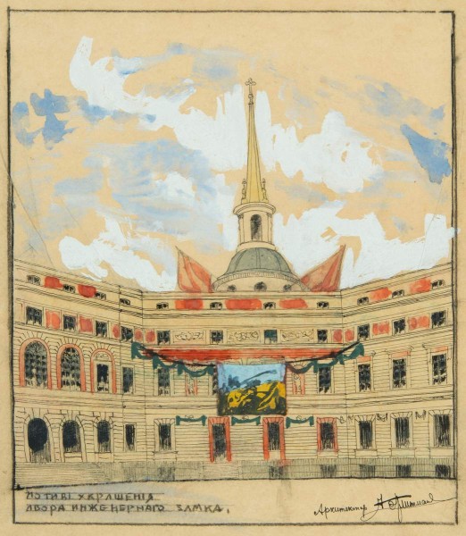 Мотив украшения двора Инженерного замка. Эскиз оформления к 7 ноября 1918 года в Петрограде