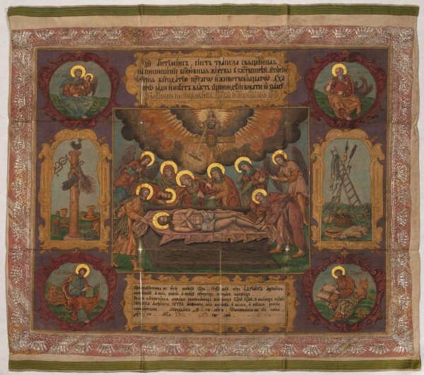 Надпись в верхнем картуше: «Сий антиминс си есть трапеза священная на приношение Безкровныя Жертвы в Б(о)ж(е)ственной Литургии ос(вя)тися бл(а)годатию Пр(е)с(вя)таго и Животворящаго Д(у)ха сего ради имеет власть с(вя)щеннодейс(т)вовати во храме Б(о)голепнаго Преображения Г(о)с(по)да Б(о)га и Сп(а)са н(а)шего Иисуса Христа».